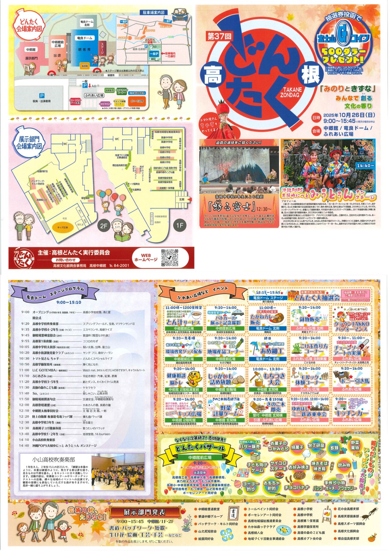 第37回高根どんたく 2025 9/19 イベント情報 2025年9月19日 開催日: 2025年10月26日カテゴリー: イベント情報 「第37回高根どんたく」を開催します。 日時: 令和7年10月26日(日曜日) 午前9:00~午後15:45 場所: 高根中郷館、竜良ドーム、ふれあい広場 イベント情報